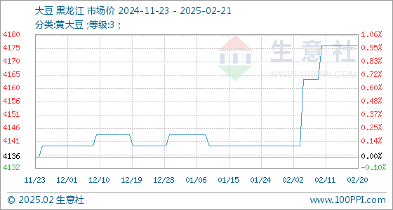 2月21日,生意社大豆基准价为4176.00元/吨,与本月初(4140.00元/吨)相比,上涨了0.87%。