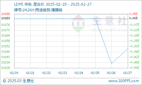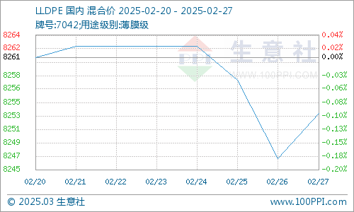 据生意社商品行情分析系统监测,LLDPE(7042)2月20日均价8261元/吨,2月27日均价在8246元/吨,期间报价下跌0.18%。LDPE(2426H)2月20日均价10183元/吨,2月27日均价在10133元/吨,期间报价下跌0.49%。HDPE(2426H)2月20日均价8412元/吨,2月27日均价在8387元/吨,期间报价下跌0.30%。