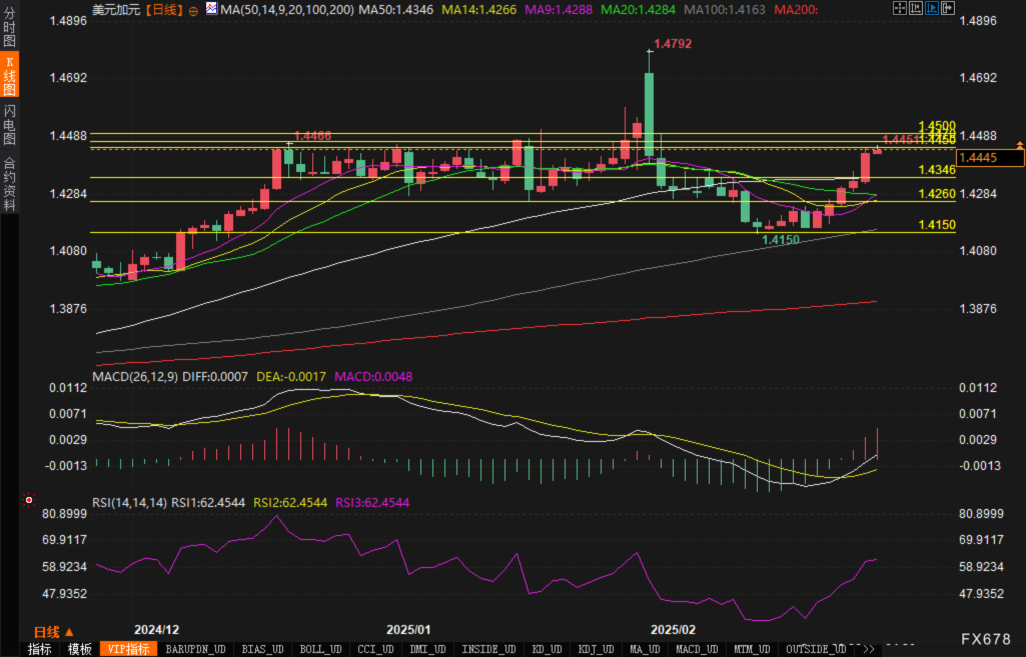 汇通财经APP讯——周五(2月28日)欧市盘前,美元/加元(USD/CAD)延续了前一交易日突破50日简单移动平均线(SMA)的上涨势头,继续获得正向推动,完成了六天的连涨,汇价在亚洲时段成功突破了1.4450-1.4455区间,创下近四周来的新高。此次上涨的主要驱动因素是美元的持续走强,以及美国经济数据的支撑。