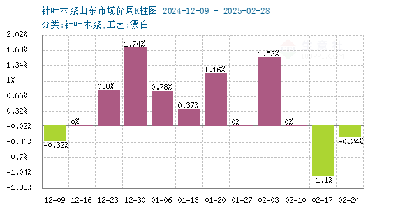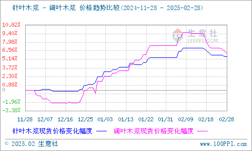 据生意社商品行情分析系统监测:2025年2月针叶木浆和阔叶木浆价格均呈现先涨后降的走势。2月28日针叶木浆山东地区市场均价为6610元/吨,与2月1日均价相比上涨了0.15%。2月28日阔叶木浆山东地区市场均价为4820元/吨,与2月1日均价相比下降了1.23%。