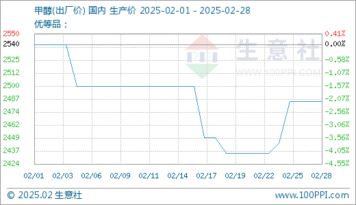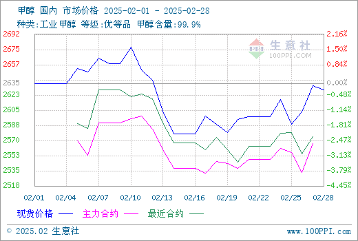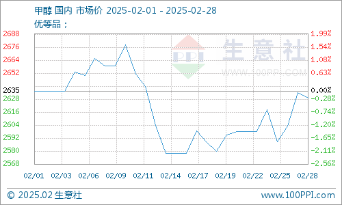 据生意社商品行情分析系统,国内甲醇市场行情震荡整理,2月1日至28日(截止下午15:00),国内甲醇市场华东港口均价自2635元/吨下跌至2629元/吨,周期内价格跌幅0.25%,最大振幅3.73%,价格同比下跌3.69%。