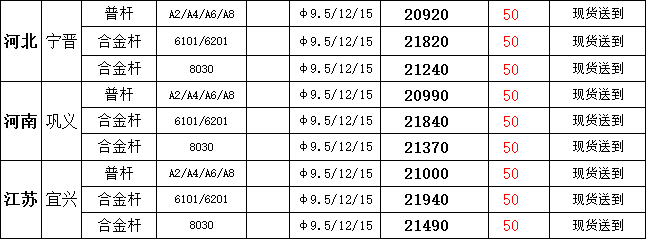 2月28日宁晋市场普铝杆现货报盘价20920元/吨,较上一交易日报价涨50元/吨;巩义市场普铝杆现货报盘价20990元/吨,较上一交易日报价涨50元/吨;宜兴市场普铝杆报盘价21000元/吨,较上一交易日报价涨50元/吨。