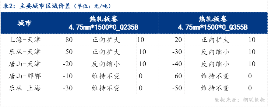 从区域价差来看,4.75mm普卷华南与华北价差50元/吨,华东与华北价差80元/吨,华南与华东价差-30元/吨。京津冀地区价差来看,唐山与天津价差-20元/吨,唐山与邯郸价差-10元/吨。