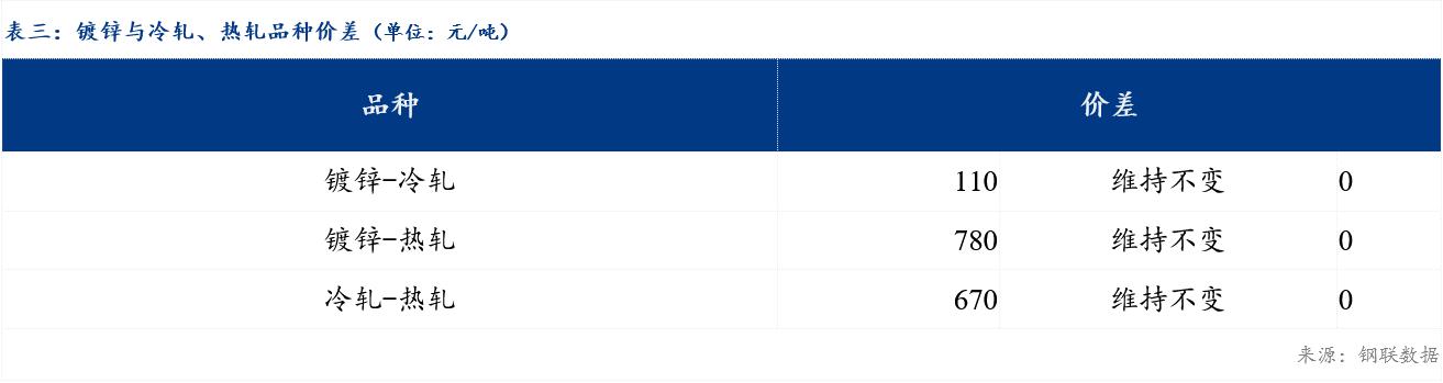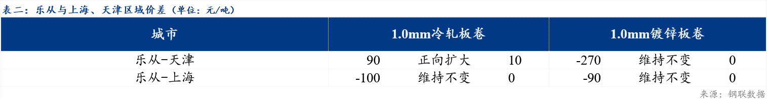 今日冷轧板卷乐从与天津价差较上一交易日扩大20元/吨,乐从与上海价差较上一交易日持平;镀锌板卷乐从与天津价差较上一交易日持平,与上海价差较上一交易日持平。品种价差方面,镀冷价差较上一交易持平,镀热价差较上一交易日持平,冷热价差较上一交易日持平。