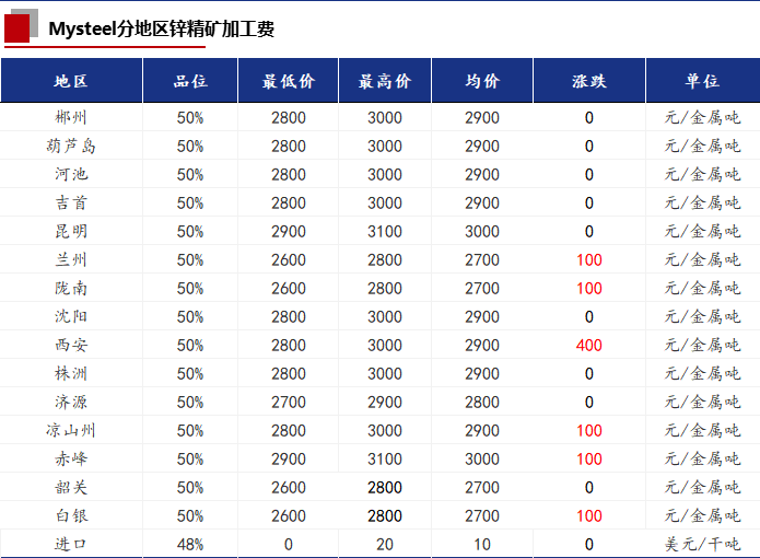 华北地区:内蒙古某锌精矿生产企业50品位锌精矿加工费2700元/金属吨出厂。