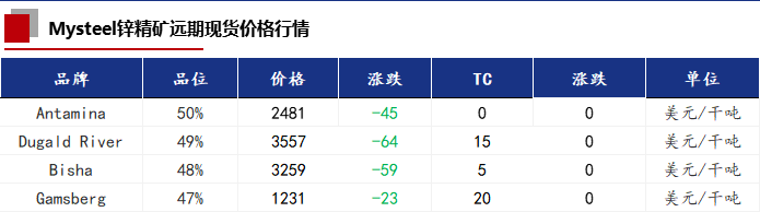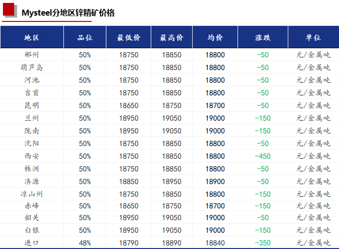 今日受锌价的影响,锌精矿价格下降50元/金属吨。国内锌精矿加工费零星上调,进口市场TC主流报价在10-20美元/干吨,今日暂无调整。