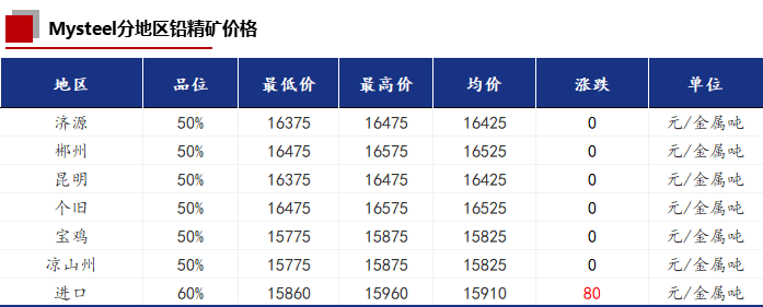 今日受价格影响,铅精矿价格较上一交易日持平元/金属吨。铅精矿加工费各地区均未调整,较上一交易日持平。进口铅精矿价格较上一交易日涨80元/金属吨。