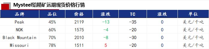 西北地区:甘肃某铅精矿生产企业50品位铅精矿加工费600元/金属吨出厂 ;