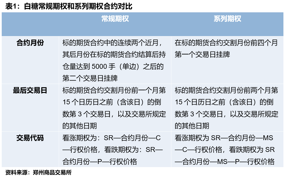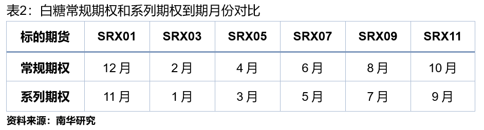 白糖常规期权面临到期月份不连续的问题。尤其是在主力期权到期后,下个主力月期权距离到期时间较长,投资者对其需求不高,期权市场流动性变差。针对这一问题,郑商所推出白糖系列期权,对白糖常规期权进行补充。与常规期权相比,系列期权在合约月份、最后交易日以及交易代码上有所变动。
