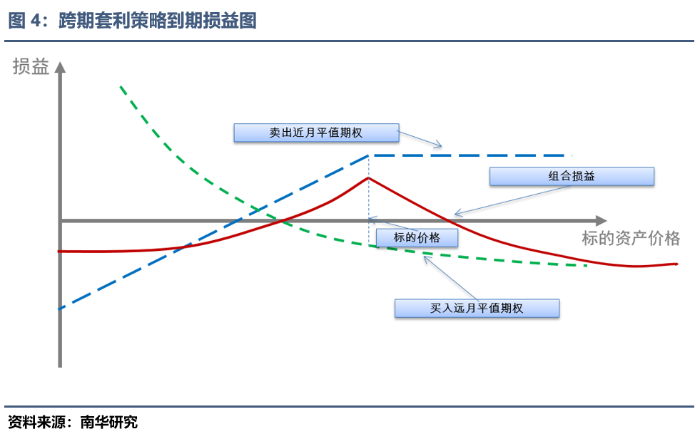 基于白糖基本面和波动率情况,投资者可以关注跨期套利策略,卖出SR507系列平值期权,买入SR507常规平值期权。跨期套利的盈利点主要在于期权的因时减值因素,由于近期到期期权因时衰减远胜于远期到期期权,便存在了套利的机会。随着时间的消逝,因时减值的作用在近期到期期权上程度会比到期日较远的期权要大得多,即近期期权价值的衰减要远胜于到期日较远的期权。由于远月期权的VEGA更高,该策略也是一个多VEGA的策略,当波动率上升时,远月期权权利金涨幅较近月期权更高。卖出看涨期权策略到期损益情况如下图所示: