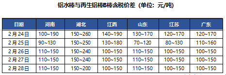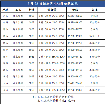 2月28日A00铝锭现货价华东20590,涨50;华南20580,涨40;中原20490,涨50(单位:元/吨)。下游按需采买,观望居多,今日再生铝棒价格持平居多。