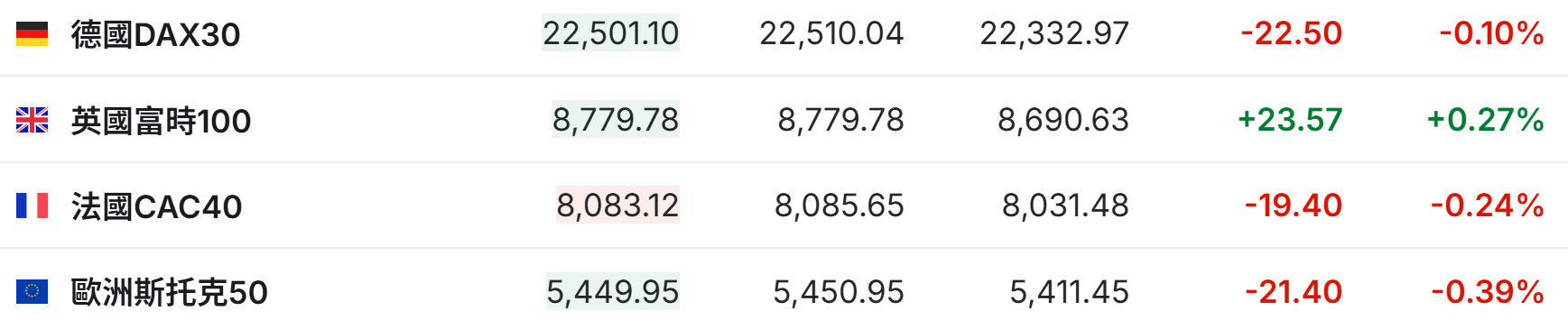2. 截至发稿,德国DAX指数跌0.10%,英国富时100指数涨0.27%,法国CAC40指数跌0.24%,欧洲斯托克50指数跌0.39%。