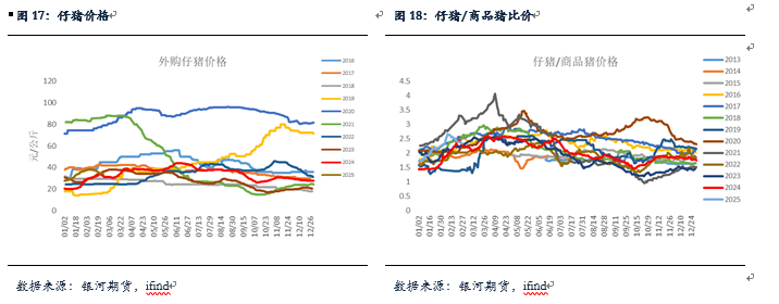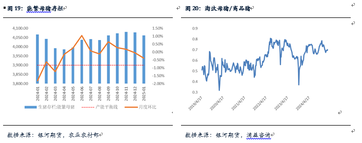 1月以来,各口径能繁母猪存栏环比数据呈现较大差异,其中,官方口径1月能繁存栏环比下降0.39%至4062万头,在三方机构中,钢联环比下降0.04%,涌益环比上升0.63%。整体来看,1月期间市场补栏比较有限,但淘汰母猪与商品猪比价整体下行,因此,整体能繁母猪存栏下行概率较大。2月期间,整体价格以及产能端变化不大,预计总体能繁存栏整体维持稳定。