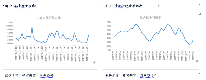 二次育肥呈现明显增加态势,根据涌益口径显示,2月前20日,二育销量占比在11-20日期间达到5.49%,处于最近一段时间的绝对高位,并且,从育肥户栏舍利用率来看,总体利用率也由前期低点回升至25%左右。近期二育的增加同样对于供应释放有一定缓冲,后续逐步出栏可能也将呈现一定的压力。不过,从当前整体生猪价格以及育肥成本来看,二次育肥利润其实比较一般,二育增加的主要动力仍然源于当前肥标价差较高以及前期存栏较低所致,因此,后续增量可能相对比较有限。