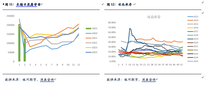 整体来看,此前餐饮以及猪肉消费表现比较良好,社零数据以及猪肉消费相关数据均显示猪肉消费支撑力度有所增加。但本月以来,可以看到猪肉消费呈现一定走弱状态。参考生猪高频屠宰数据,2月生猪屠宰环比下降38.7%,同比下降20.94%,但是可以看到,在此期间,冻品库存呈现明显增加态势,与之伴随的是生猪鲜销率呈现下行,说明实际流入终端猪肉数量相对受限。并且,从绝对价格来看,当前猪价呈现逐步下行态势,这一定程度反应了需求支撑力度有限的情况。