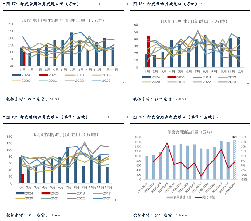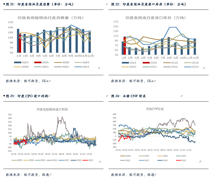 近期印度对于棕榈油洗船较多,主要是3-6月船期,我们预计2月印度棕榈油进口量约在60万吨,环比增加明显,但仍处历史同期较为偏低水平。目前印度对于CPO时有进口利润,对豆油和葵油进口利润倒挂,葵油进口利润有所好转,豆棕价差震荡上涨至-30美元附近,印度对棕油或仍有进口需求。不过近日市场传闻印度正考虑在未来六个月内再次上调食用油进口关税,可能会抑制印度国内对豆棕葵油的进口需求,同时推高国内油脂价格。对于24/25年度印度食用油进口情况,近日SEA以及海外预计24/25年度印度食用油进口量可能增至1600-1660万吨,其中棕榈油可能降至750-775万吨,而豆油的进口增量则有望在100-150万吨至近500万吨的水平,体现出豆油对棕榈油的进口替代,但豆油很难完全对棕榈油进行替代,750-775万吨的棕榈油年度进口水平仍不算很低,印度每年对棕油消费整体较为平稳。