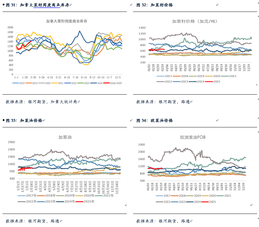 国际菜籽产量及库存方面,从全球的角度看,目前USDA对于24/25年度全球菜籽产量的预估约在8531万吨,同比减少408万吨,而油世界最新预计全球菜籽产量在7470万吨,同比减少530万吨,减产较多的主要是欧盟,约减330万吨,全球菜籽库消比从上一年度的18.5%降至14.6%,菜籽供应格局较为偏紧,对菜油价格存在一定支撑。另外,加拿大产量和库存方面,根据加拿大统计局数据显示截止到24年12月底加菜籽总库存在1140万吨,同比下降270万吨,其中农场菜籽库存同比减少300万吨。不过商业库存近几周出现增加,截至2月16日加拿大油菜籽商业库存为141.07万吨,目前增至历史同期较为中性水平。油世界预计24/25年度(8月-次年7月)加菜籽结转库存约在150万吨的偏低水平,整体上后期加菜籽供应将越来越紧。近日加拿大农业部预计2025/26年度加拿大油菜籽播种面积降至850万公顷,同比减少40万公顷,产量随之减少约在1750万吨,较上一年度相比减少1.93%,2025/26年度加拿大油菜籽供应或将较为紧张。