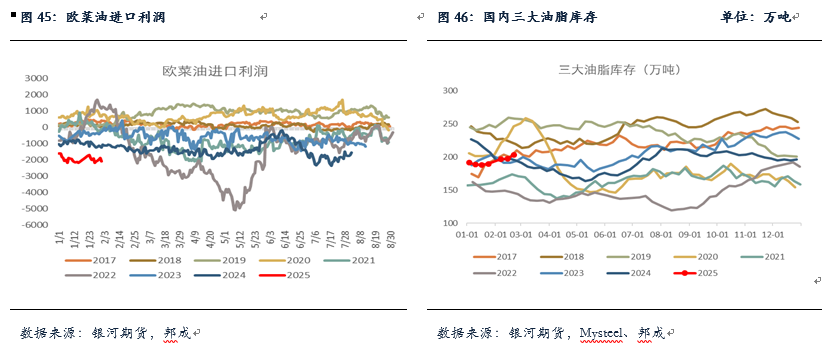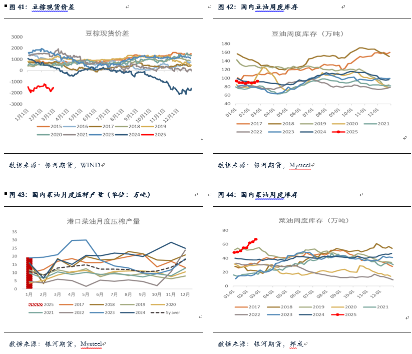 菜籽压榨方面,1月国内菜籽压榨约在45万吨,菜油压榨产量约在19万吨的历史同期高位,不过环比下降约6万吨,主要是高基数的影响。进口及买船方面,据Mysteel预估1、2月菜籽到港分别在19.5、13万吨,处于历史同期偏低水平。库存方面,目前国内菜籽库存持续去库,截止到2/21日国内菜籽继续去库至41万吨,但仍处于历史同期较为偏高水平,短期菜籽供应较为充足,但随之菜籽后期到港减少,国内菜籽库存将加速去库。另外,截至2025年2月21日,菜油库存67.35万吨,环比上周增加3.4万吨,增幅5.3%,仍处于历史同期高位。菜油基差维持低位震荡,广西三菜基差报至05+10,预计4月之后国内菜油库存或将高位去库。目前国内菜油基本面变化不大,菜油供应端持续承压,菜油供大于求的格局持续,但菜油盘面受政策面影响较大,川普对于生柴的不支持态度以及美国对加拿大加征关税将对加菜油出口至美国产生不利影响,与此同时中加反倾销调查仍未落地,需警惕中加关系缓和可能带来的加菜籽和加菜油流向国内,政策端的不确定性后期还需持续关注,短期预计菜油继续维持区间震荡运行,OI5-9可考虑逢高做缩。