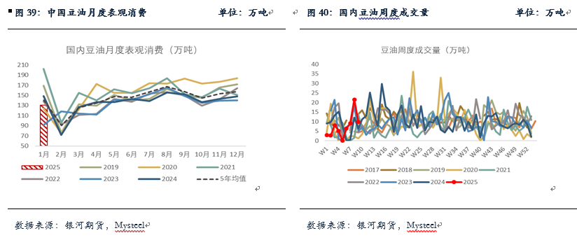 大豆压榨方面,1月大豆压榨约在650万吨,豆油压榨产量约在124万吨,低于5年均值。截止到2/21日当周,油厂大豆实际压榨量215.35万吨,开机率为60.54%,较前一周有所增加,不过近期由于缺豆,部分地区油厂出现断豆停机,预计大豆压榨量或将下降。大豆进口和买船方面,预计2、3月国内大豆进口到港量合计约在800万吨左右。库存方面,截至2025年2月21日,全国重点地区豆油商业库存92.88万吨,环比上周增加3.51万吨,增幅3.93%,处于历史同期较为中性略偏低水平,豆油基差暂稳,华东基差报在05+520附近。由于豆油性价比较高,节后以来现货市场整体较好,下游按需采购,截止2/27日当周,豆油现货累计成交高于5年均值水平。整体上,目前国内豆油性价比较好,库存维持在中性略偏低水平,短期受大豆到港偏少等因素影响,豆油库存或将易降难增。盘面受海关通关检查、大豆抛储传闻以及中美关系、美国生柴政策等多方面因素扰动,但近月大豆偏紧对盘面起到一定支撑,之后3月底4月初随着巴西大豆逐渐到港,大豆短缺情况将有望好转,国内豆油开始逐渐累库,短期豆油预计震荡运行,Y5-9可考虑逢高做缩。