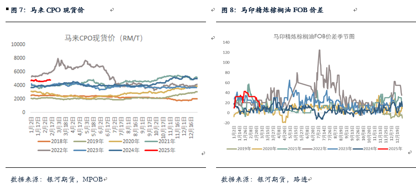 另外,马来西亚维持3月毛棕榈油出口税率为10%,并下调了参考价至每吨4390.37林吉特(约合988.38美元),而2月的参考价格为每吨4817.70林吉特。目前马印24度价差震荡收窄,但仍处历史同期偏高水平,而马来CPO现货价维持高位偏稳状态。