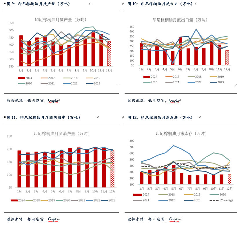 印尼方面,目前Gapki数据仅公布到24年11月,不过根据Gapki年度平衡表推算,12月马棕产量预计在423万吨,环比减少10%,略低于5年均值;出口预计仅有203万吨,出口表现明显欠佳,处于历史同期低位,国内消费较为平稳,年底结转库存约在257万吨,与11月基本持平,库存仍偏紧。