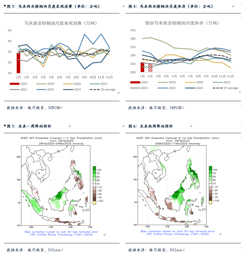 对于2月马棕产量及出口,UOB预计2月前20日马棕产量环比-7%至-3%,MPOA则预计环比减产5.78%。2月以来马来累计降雨量没有1月那么高,但地区出现明显的旱涝差别,其中东马降雨处于历史同期偏高水平,而西马如彭亨等地较为偏干,降雨处于历史同期低位。从降雨预估图来看,未来1-2周东马地区降雨仍然明显偏多,我们预计2月马棕产量或将降至120万吨以下。出口方面,ITS数据显示2月马棕出口减少11%至106万吨,较前25日的减少2%减幅有所增加,从国别来看其中出口到中国和印度的棕榈油增幅更为明显。整体上,我们预计2月马棕月末库存或将继续去库至150万吨左右,马棕供应仍较为偏紧,库存拐点可能要到3月份。