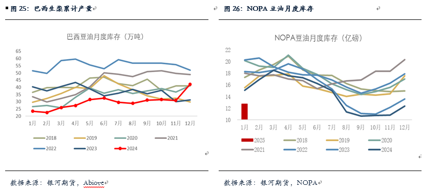 国际豆油方面,近日巴西国家能源委员会决定2025年3月起柴油中生物柴油的强制性掺混比例将保持在14%,而不是此前预期的15%,此举是巴西政府为应对食品价格上涨压力而采取的重要措施。此前我们测算,假如25年能够成功实施B15,将为新一年度的巴西生柴消费带来65-75万吨左右的增量,粗略估计生柴中豆油用量的增量在50-60万吨左右。目前B15掺混政策暂缓将不利于豆油在生柴中的消费,不过巴西生柴并非强制性,若后期价格合适以及存在掺混利润,巴西可能还会上调掺混比例。ANP对于巴西生柴产量的数据公布到12月,12月巴西生柴产量在6.95亿升,环比减少15%,24年全年巴西生柴累计产量在91亿升的高位,生柴累计销量在89亿升。截止到12月,巴西豆油库存增至42万吨,高于5年均值。另外,NOPA数据显示美豆油1月库存增加至12.74亿磅,但处于历史同期低位,目前南北美豆油库存均较为偏低,不过美豆油用于生柴的性价比较其他油脂较好。