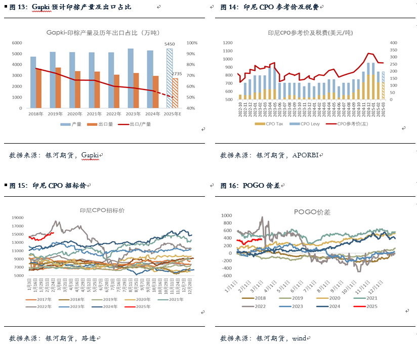 对于25年印棕供需情况,近日Gapki预计今年印棕产量将增加174万吨至5450万吨,与此同时随着印尼B40生柴政策的实施,其国内生柴需求增加,国内整体消费增量约在350万吨,其中生柴消费增量在210万吨,出口受产量恢复较少和生柴需求增加的限制,预计今年印棕出口难有增量,甚至可能出现下降,从而使得25年底印棕结转库存或将降至240万吨的低位。对于印棕今年产量的恢复市场的一致性预期比较强,大多预计会恢复150-200万吨的水平,不过对于B40生柴政策的顺利实施则保持谨慎。此前印尼能矿部制定的1562万千升的生柴目标配额,后期不排除也会面临下调的可能。