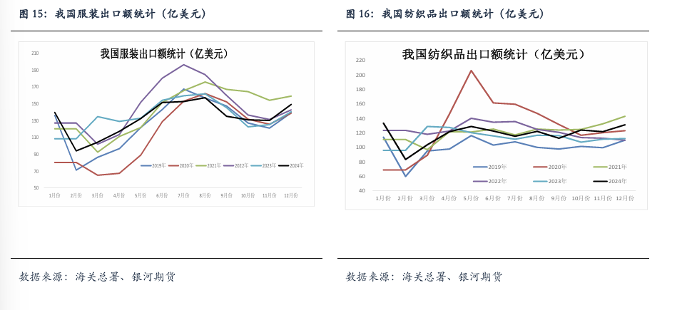 出口方面,2024年出口情况一般,但是2025年1、2月份出口预期较好,市场考虑其原因是由于企业在抢出口订单。2024年全年我国出口纺织品服装3016亿美元,同比增加1.1%;其中纺织品出口1421.1亿美元,同比增加4.5%,服装出口1595.2亿美元,同比下降1.7%。2025年我国纺服的出口不确定性较大,人民币贬值以及欧美国家需求好确实利好出口,但是川普要对我们国家商品加高关税又不利于出口,因此2025年我国纺织品服装出口存在较大不确定性。