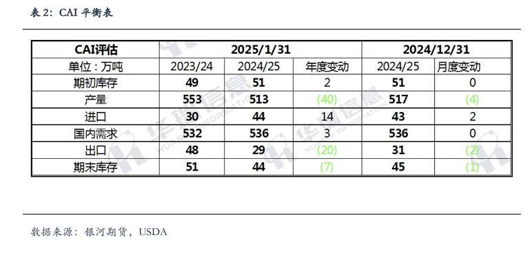 根据印度棉花协会(CAI)最新报告显示,截至2025年1月31日,CAI评估印度棉花2024/25年度棉花平衡表,与上月评估相比产量下调4万吨,进口调增3万吨,出口下调2万吨,期末库存减少1万吨。与上一年度比较,期初库存增加2万吨,产量减40万吨,进口增加14万吨,国内需求调增3万吨,出口减少20万吨,期末库存减少7万吨。截至2月27日,印度国内S-6棉花现货价格53600卢比/坎地(约78.62美分/磅)。
