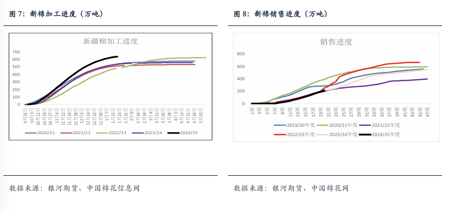 目前新棉交售情况较快,新疆地区棉产量按照目前加工情况较快,根据中国棉花信息网,截至1月22日,新疆皮棉累计加工量为640万吨,之后新疆加工数据暂停更新。