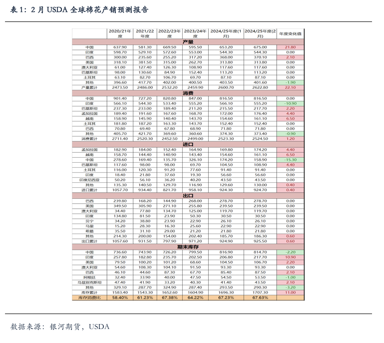 一、国际市场:全球棉花产量略有调增,全球供需结构矛盾不大。