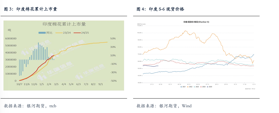 印度棉上市进度整体略快于去年同期,据CAI公布的数据统计显示,截至2025年2月24日当周,印度棉花周度上市量10.7万吨,同比减66%;印度2024/25年度的棉花累计上市量360.7万吨。CAI累计上市量达24/25年度预测平衡表产量(513万吨)的70.3%,同比快6%。