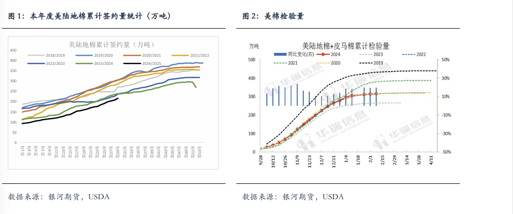 根据最新USDA供需报告来看,本年度美棉产量未作明显调整,2月预估美棉产量在314万吨,处于历史中低位置。根据美国农业部的统计,截至2025年2月14日当周,美陆地棉+皮马棉累计检验量为316万吨,占年美棉产量预估值的100.6%(2024/25年度美棉产量预估值为314万吨)。