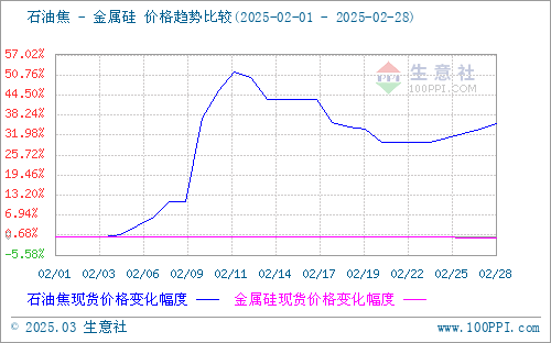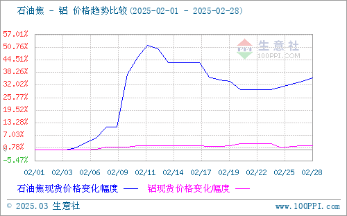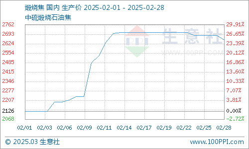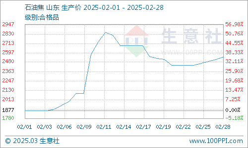 据生意社商品分析系统显示,2月份地炼石油焦行情大幅上涨后回落,价格整体上涨,国内主要地炼厂家石油焦产品主流均价2月1日为1877.50元/吨,2月28日为2545.00元/吨,月涨幅为35.55%。