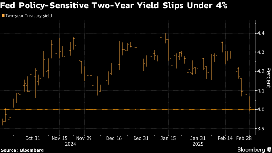 随着温和的通胀数据提振了对美联储降息的押注,美国国债市场录得7月以来的最大月涨幅,以短期收益率回到4%以下为2月份画上句号。
