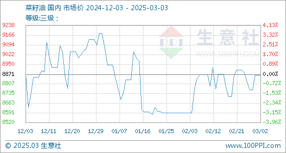 3月3日,生意社菜籽油基准价为8870.00元/吨,与本月初持平。