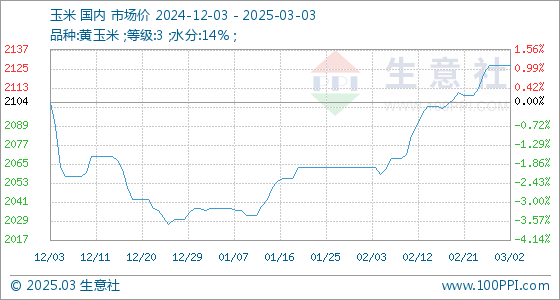 3月3日,生意社玉米基准价为2127.14元/吨,与本月初持平。