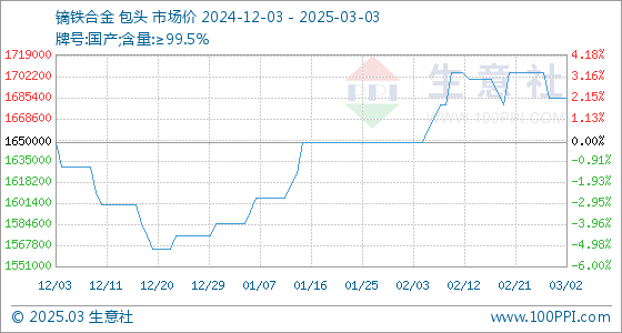 3月3日,生意社镝铁合金基准价为1685000.00元/吨,与本月初持平。