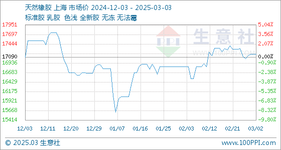 3月3日,生意社天然橡胶基准价为17166.00元/吨,与本月初持平。