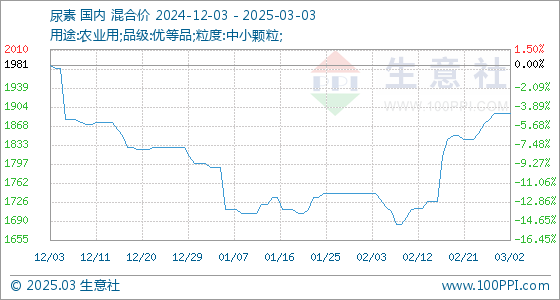 3月3日,生意社尿素基准价为1892.00元/吨,与本月初持平。