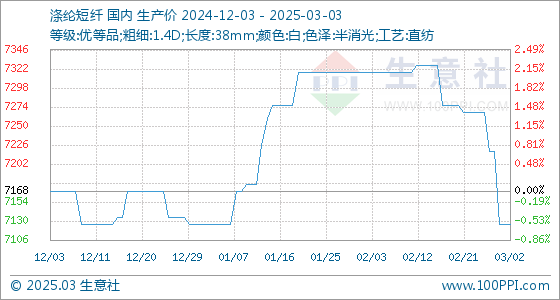 3月3日,生意社涤纶短纤基准价为7126.67元/吨,与本月初持平。