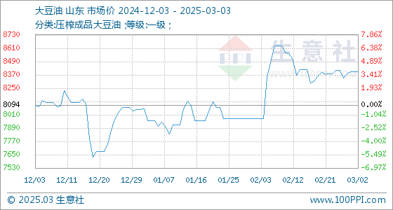 3月3日,生意社大豆油基准价为8400.00元/吨,与本月初持平。
