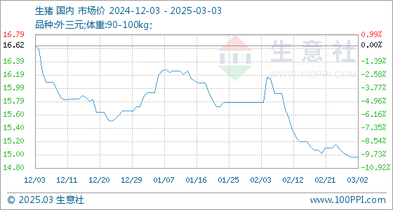 3月3日生意社生猪基准价为14.97元/公斤
