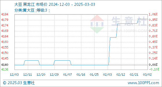3月3日,生意社大豆基准价为4180.00元/吨,与本月初持平。