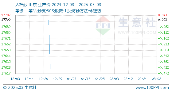 3月3日,生意社人棉纱基准价为17625.00元/吨,与本月初持平。
