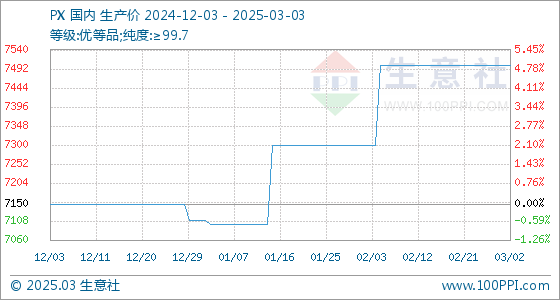 3月3日,生意社PX基准价为7500.00元/吨,与本月初持平。