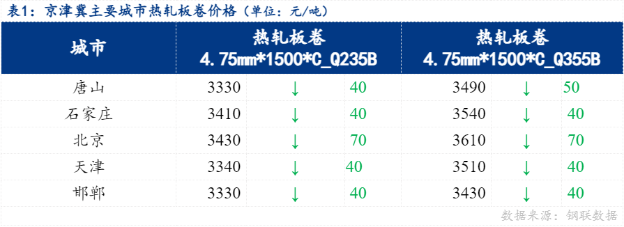 京津冀地区热轧板卷价格震荡下行,其中北京市场下跌70元/吨,唐山、石家庄、天津、邯郸市场价格下跌40元/吨。