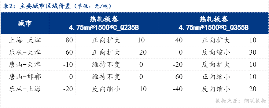 从区域价差来看,4.75mm普卷华南与华北价差60元/吨,华东与华北价差80元/吨,华南与华东价差-20元/吨。京津冀地区价差来看,唐山与天津价差-10元/吨,唐山与邯郸价差持平。