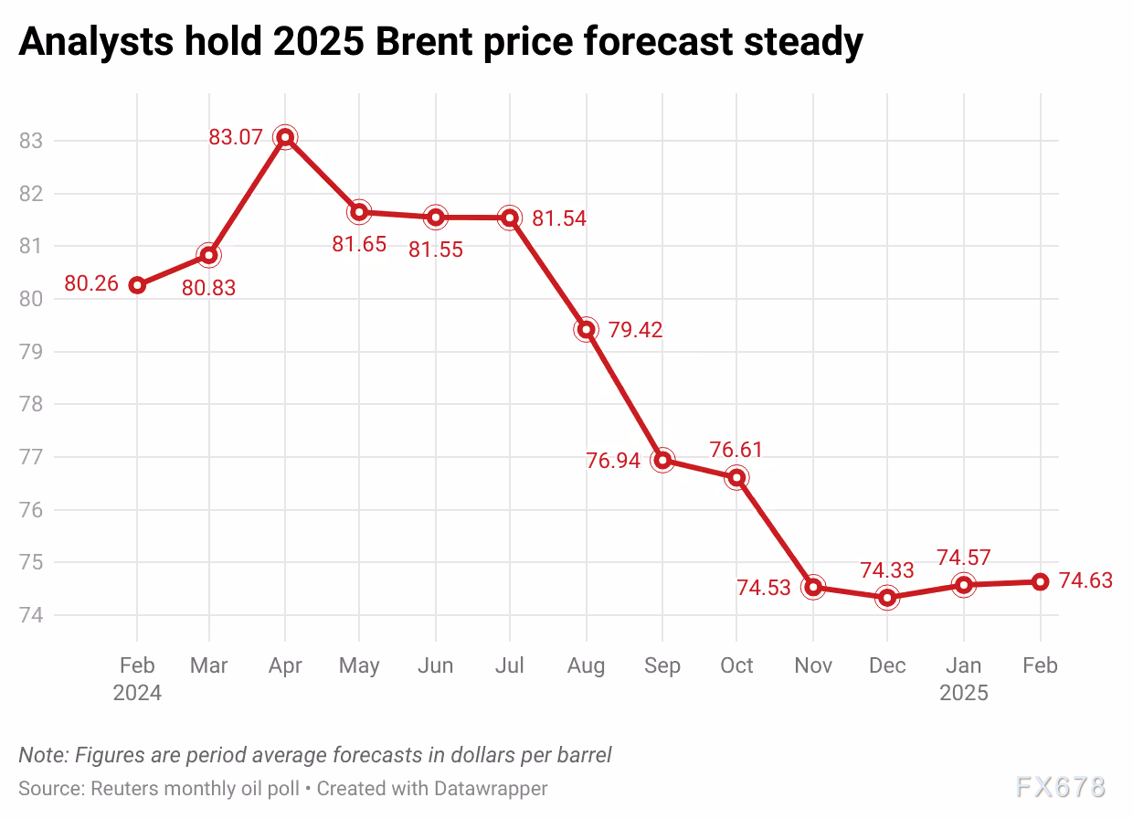 路透调查显示,41位经济学家和分析师预测,2025年布伦特原油平均价格为每桶74.63美元,略高于1月预测的74.57美元;美国西德克萨斯中质油(WTI)的平均价格为每桶70.66美元,前次预测为70.40美元。这表明市场对油价的预期基本保持稳定。
